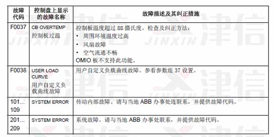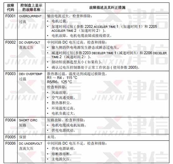 可以通過MENU/ENTER鍵來清除故障信息。如果故障依然存在,故障信息會(huì)在幾秒鐘后再次出現(xiàn)。此時(shí)需要根據(jù)故障代碼來進(jìn)行相應(yīng)的檢查和采取應(yīng)對(duì)措施。